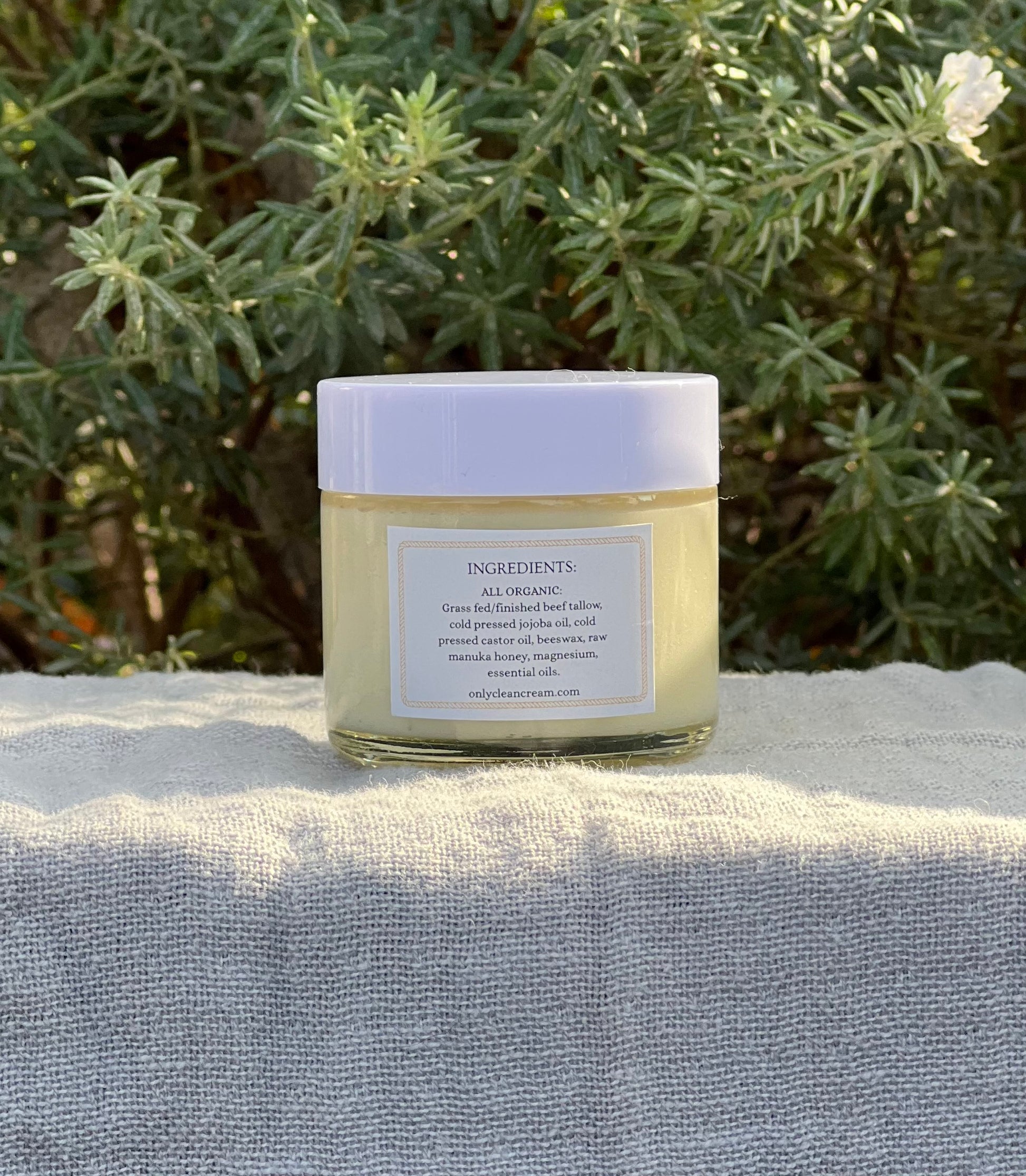 Whipped to a featherlight balm, this luxurious formula blends grass-fed, grass-finished tallow, raw Manuka honey, organic castor oil, rosehip, and transdermal magnesium—a rare and potent synergy designed to deeply nourish, calm inflammation, and restore the vitality that time, stress, and environment tend to erode.